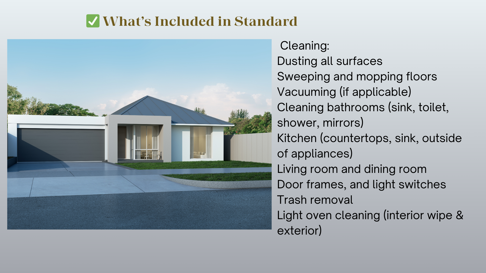 If your home needs a deep cleaning or extra attention to appliances like ovens, refrigerators, or windows, let us know—we also offer extra services you can add to your package.
